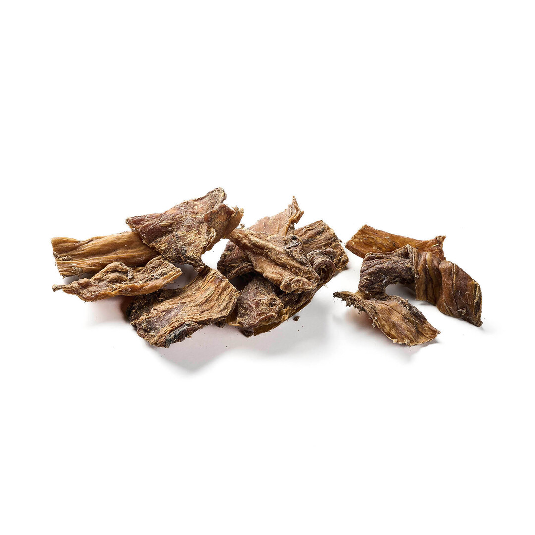 Schlund – oft auch als Dörrfleisch bezeichnet – besteht aus getrocknetem Fleisch- und Knorpelgewebe. Es ist strukturreich und wird von vielen Hunden wegen seines intensiven Geschmacks geschätzt.